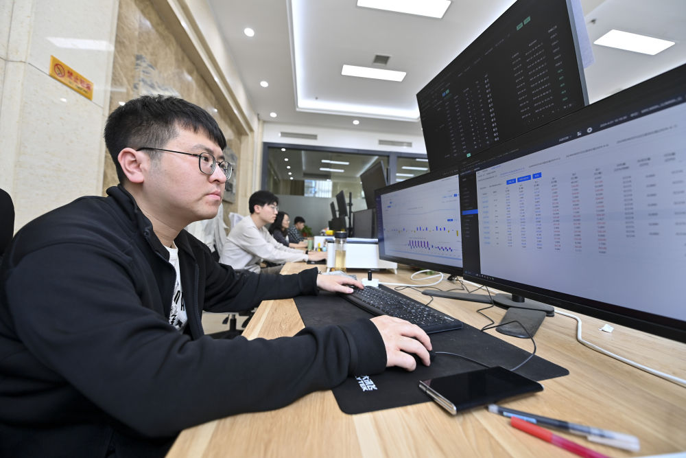 在山西省太原市小店区,晋控电力的电力交易员在电脑前工作(2024年4月1日摄)。新华社记者 杨晨光 摄