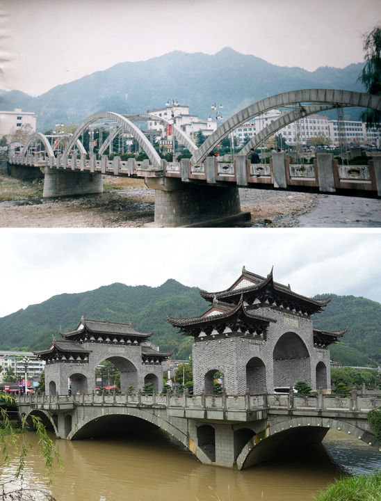 拼版照片,上图为昔日的景宁县城区府前桥(资料照片);下图为经过改建后的府前桥(新华社记者韩传号2024年6月27日摄)。新华社发
