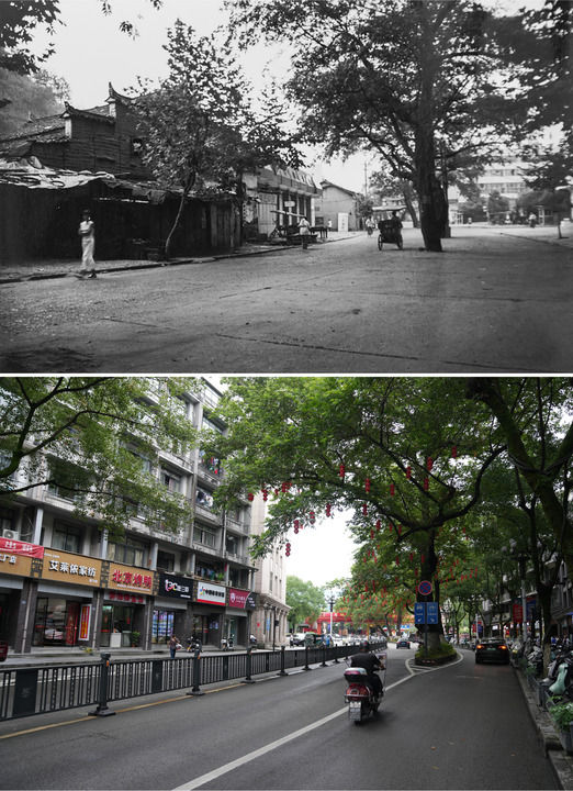 拼版照片,上图为昔日的景宁县城繁华地段“大树脑”(资料照片);下图为同一地点拍摄的景宁县人民中路“大树脑”(新华社记者韩传号2024年6月27日摄)。新华社发