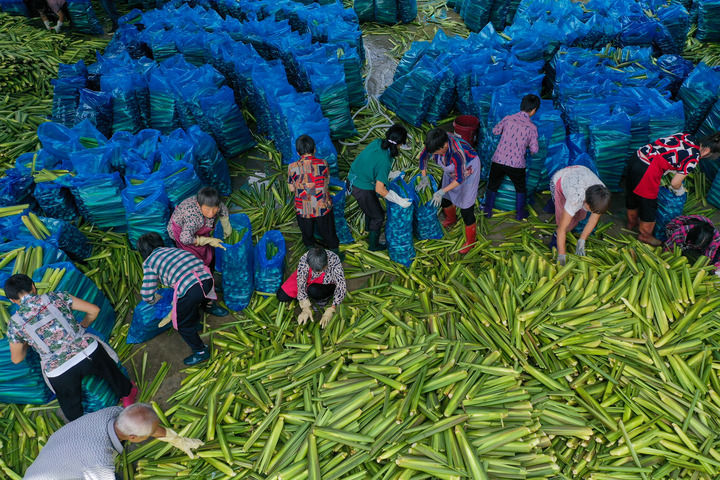2021年8月25日,在景宁县大漈乡大漈村茭白交易市场,村民将新收割的茭白打包冷藏(无人机照片)。新华社发(李肃人 摄)