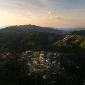 日落时分,晚霞将控拜村染成金黄色(7月10日摄,无人机照片)。
