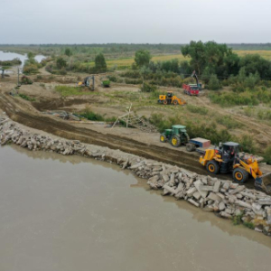 记者看到,在阿克苏地区沙雅县盖孜库木乡吐央村的一处河堤除险加固现场,抢险队伍分工明确,人们驾驶挖掘机、铲车、拖拉机等大型机械进行堤坝加固。