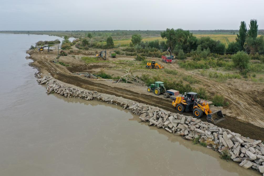 2024年8月3日,在新疆阿克苏地区沙雅县盖孜库木乡吐央村,抢险人员驾驶大型机械进行堤坝加固(无人机照片)。新华社记者 丁磊 摄