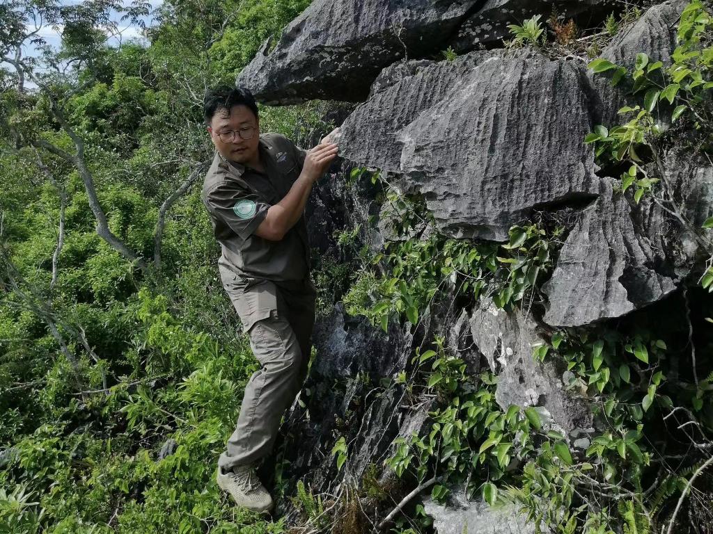 齐旭明在热带雨林中监测海南长臂猿活动。(受访者供图)