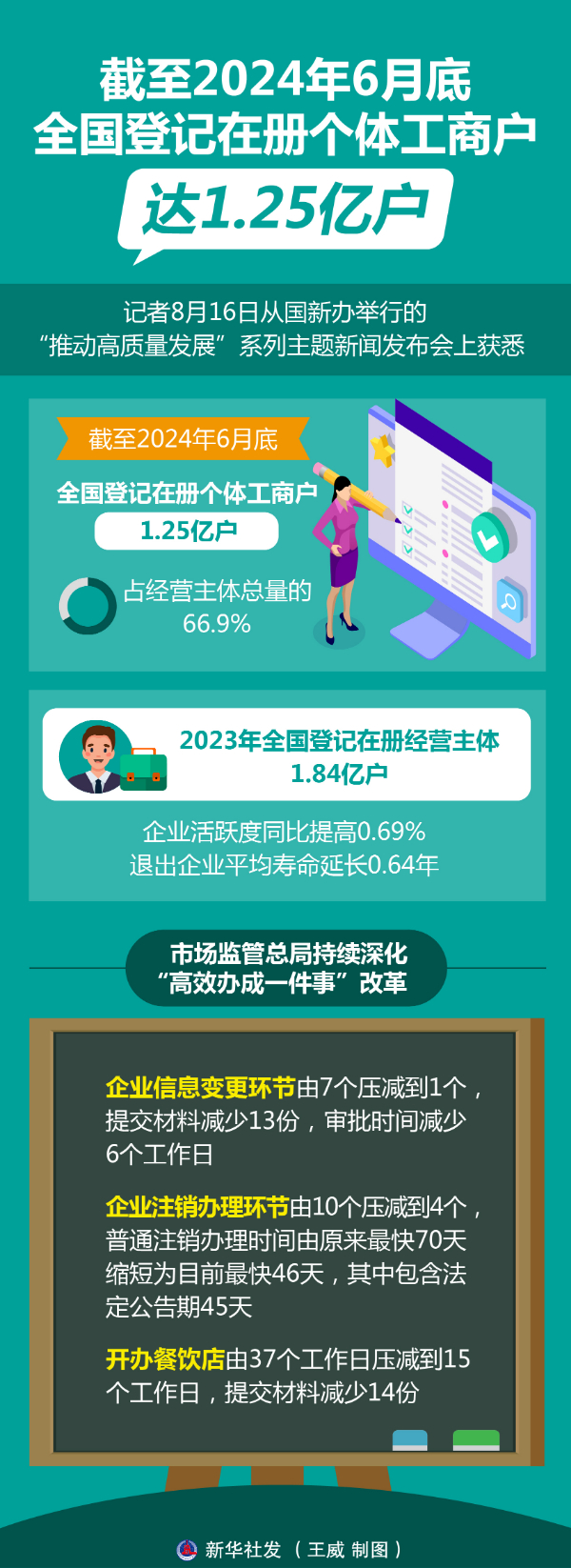 新华社北京8月16日电(记者赵文君)截至今年6月底,全国登记在册个体工商户达到1.25亿户,占经营主体总量的66.9%。