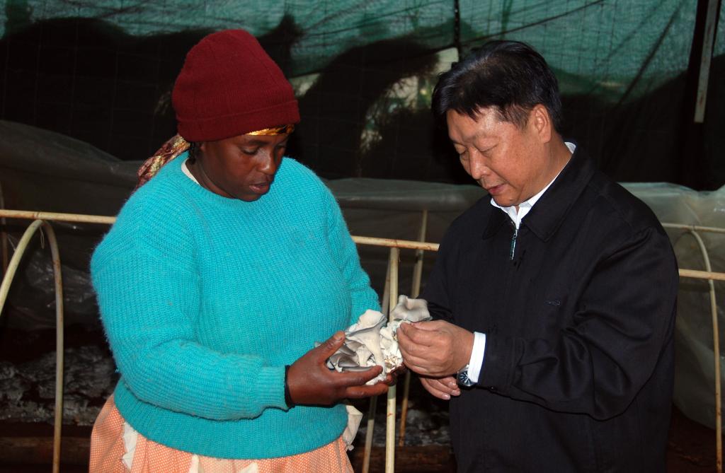 2007年10月4日,在南非东南部山区,林占熺(右)指导当地妇女种植蘑菇。 新华社记者 陈铭 摄