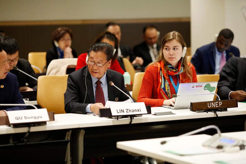 2019年4月18日,在位于纽约的联合国总部,林占熺(前排中)在“菌草技术:‘一带一路’倡议对促进落实联合国2030年可持续发展议程的实质性贡献”专题研讨会上发言。新华社记者 李木子 摄