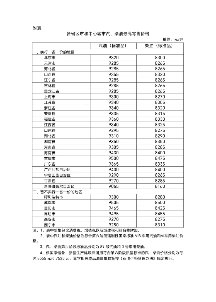 根据近期国际市场油价变化情况,按照现行成品油价格形成机制,自2024年10月10日24时起,国内汽、柴油价格(标准品,下同)每吨分别上涨140元和135元。调整后,各省(区、市)和中心城市汽、柴油最高零售价格见附表。