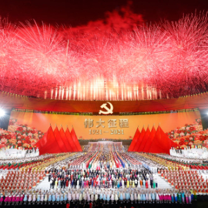 2021年6月28日晚,庆祝中国共产党成立100周年文艺演出《伟大征程》在北京国家体育场盛大举行。这是文艺演出结束,全场共同高唱《没有共产党就没有新中国》。新华社记者 黄敬文 摄