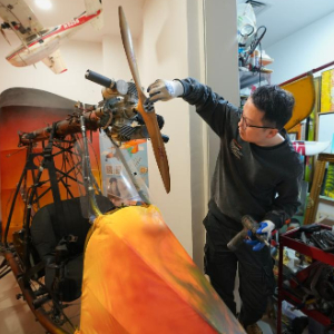 在大芬村的工作室,他搭建起工作间,开始了造飞机之旅。从学习CAD制图到寻找合适材料搭建飞机骨架,从发动机调试到亲手设计飞机外观,他常常在工作间里一待就是十几个小时。2021年5月,他的第一架飞机“艺翔号”诞生。“艺和翔代表着我在画笔与机翼间的逐梦人生。”陈剑华说。