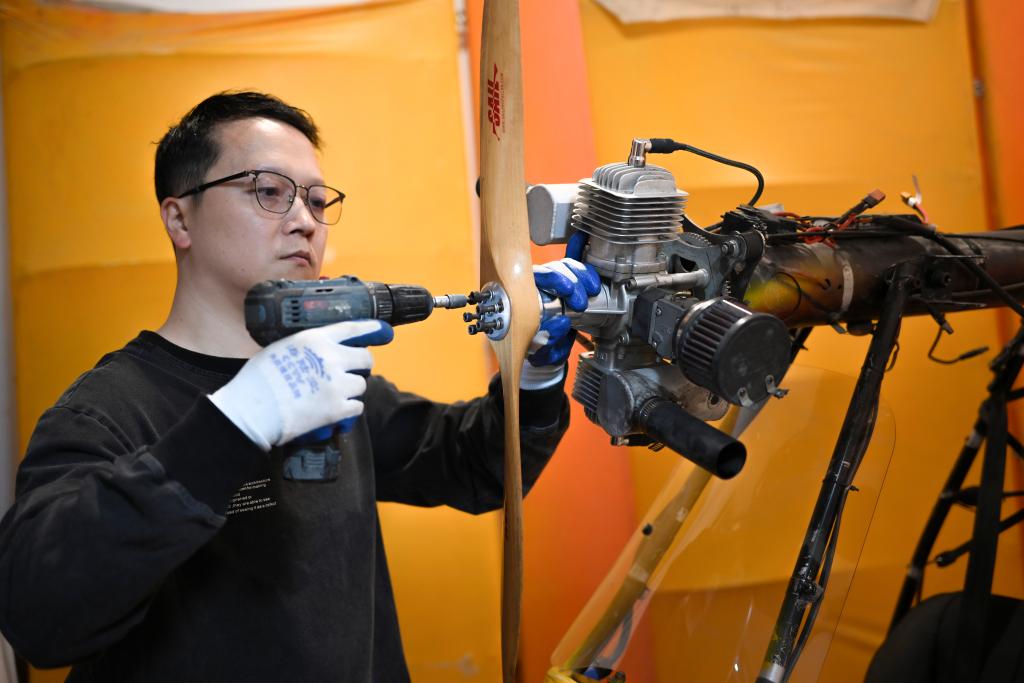 12月13日,在位于深圳市龙岗区大芬油画村的工作室,陈剑华在为自己制造的飞机安装零件。