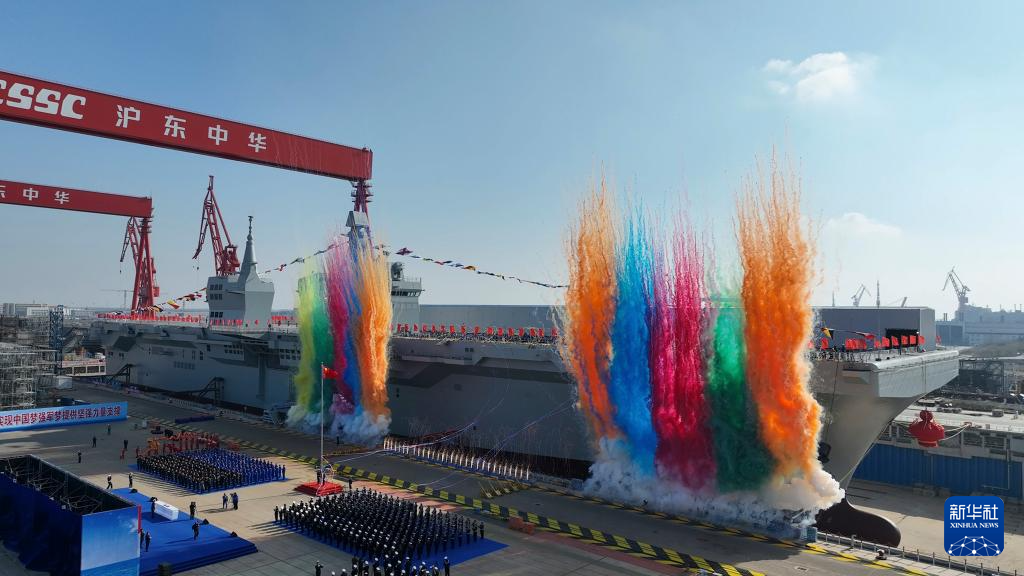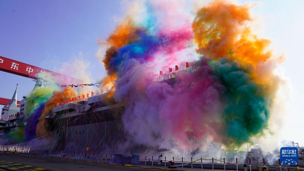12月27日上午,我国自主研制建造的076两栖攻击舰首舰下水命名仪式在上海举行。新华社发(万永康 摄)