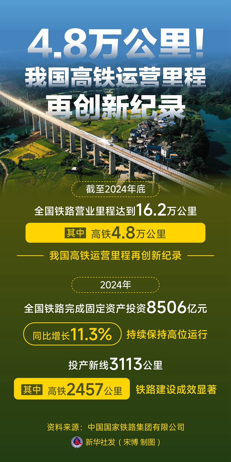 新华社北京1月2日电(记者樊曦)2日,中国国家铁路集团有限公司召开工作会议。会议发布的最新统计数据显示,截至2024年底,全国铁路营业里程达到16.2万公里,其中高铁4.8万公里,我国高铁运营里程再创新纪录。