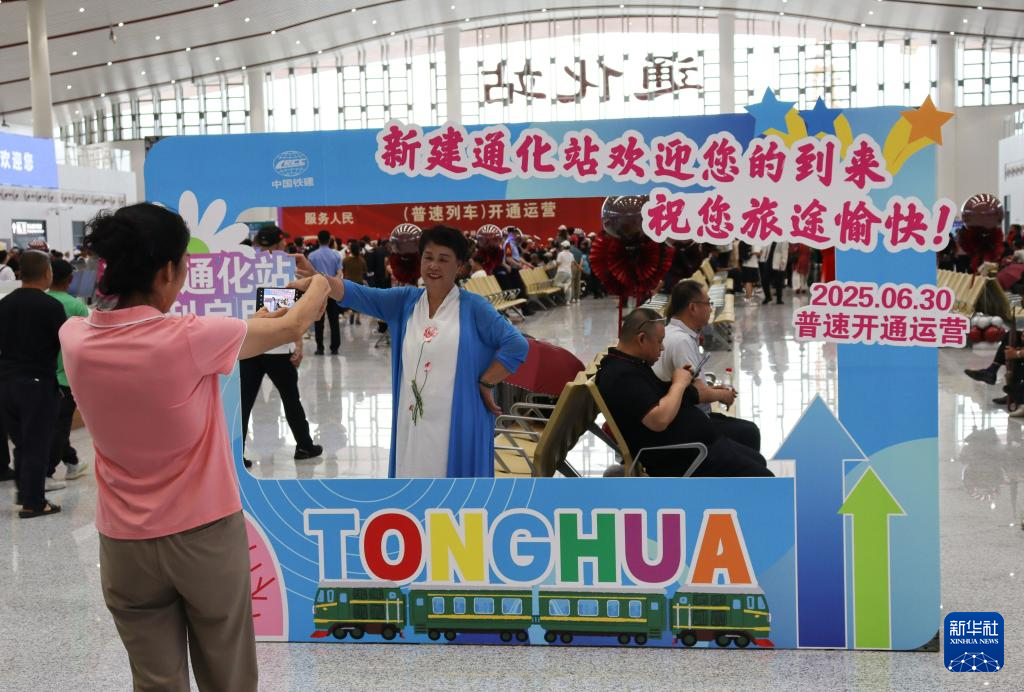 6月30日,旅客在新通化站拍照留念。新华社发(李祯林 摄)