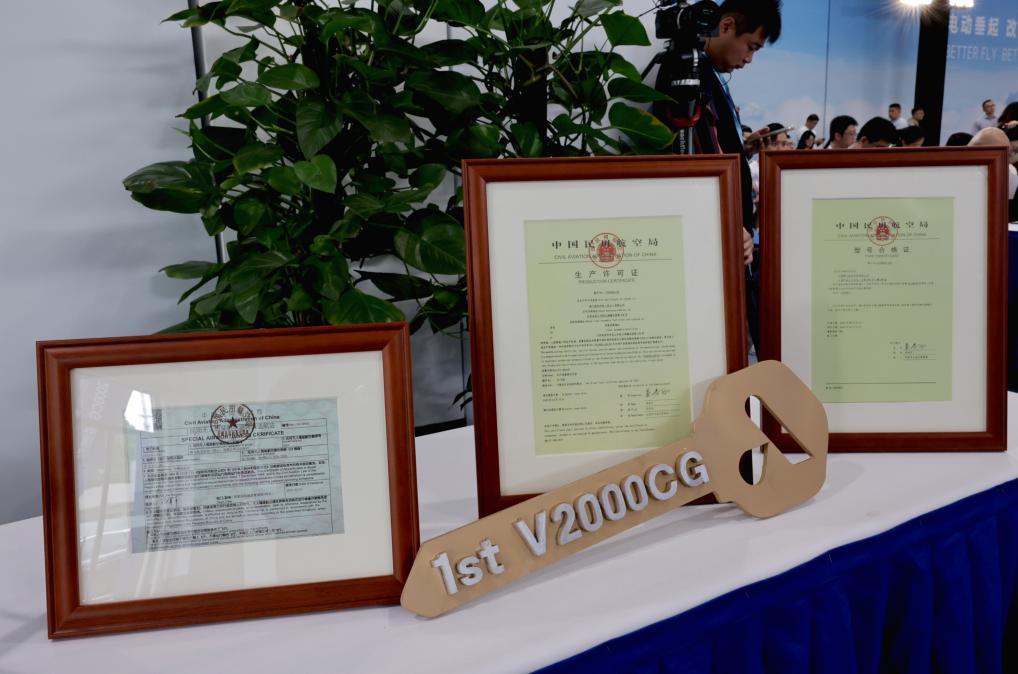 这是在交付仪式现场展示的V2000CG凯瑞鸥电动垂直起降航空器的“适航三证”(7月22日摄)。