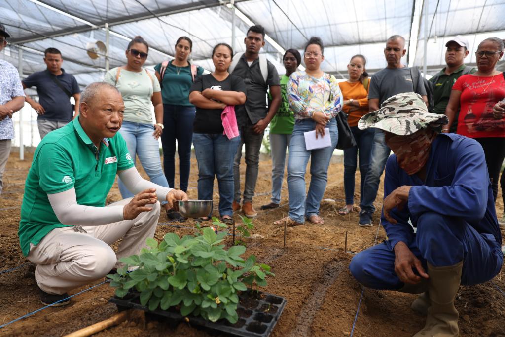 2024年4月3日,在位于苏里南萨拉马卡区的中国援苏里南农业技术合作中心,农业专家在大棚讲解秧苗移栽技术。中国援苏里南农业技术合作中心技术援助项目于2022年启动。新华社记者李梦馨摄