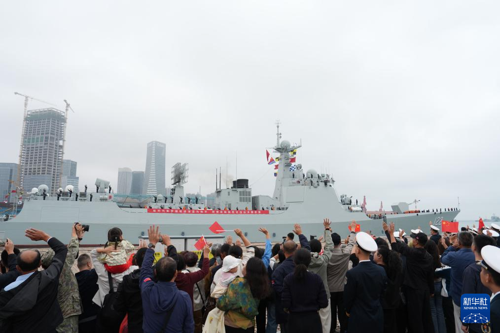 10月11日,中国海军第48批护航编队从山东青岛某军港解缆起航。这是编队中的导弹驱逐舰唐山舰驶离码头。新华社发(刘再耀 摄)