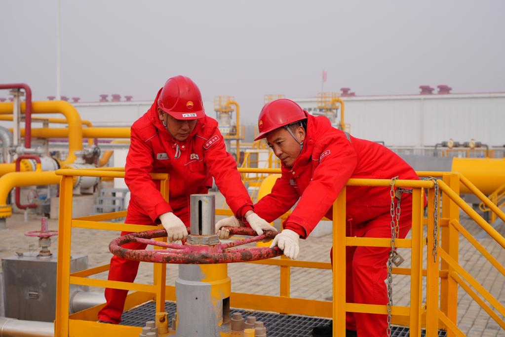 11月10日,呼图壁储气库员工缓缓打开出站球阀。(新华社发 薛梅 摄)