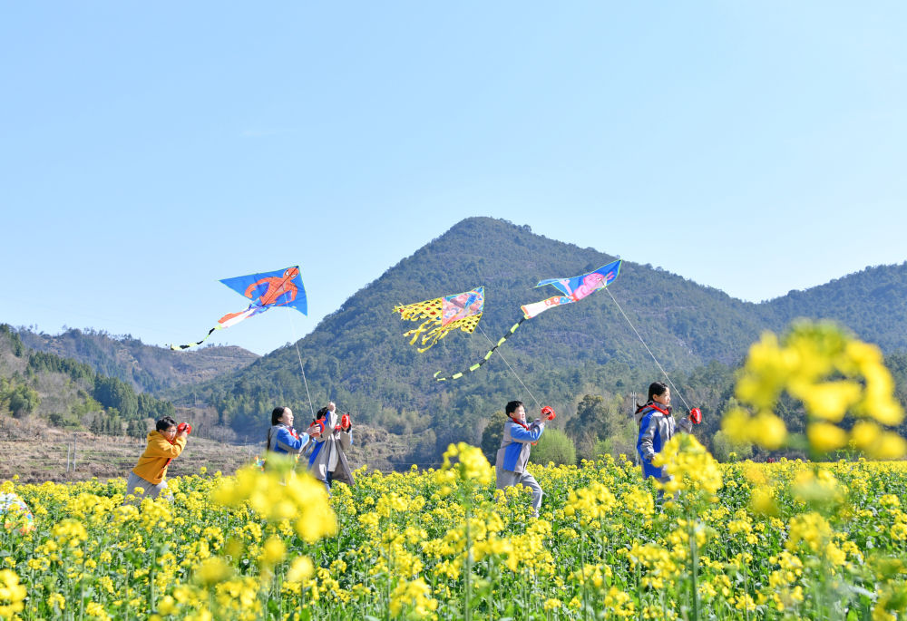 2025年3月17日,浙江省台州市仙居县双庙乡中心小学学生在油菜花丛中放风筝。新华社发(王华斌 摄)