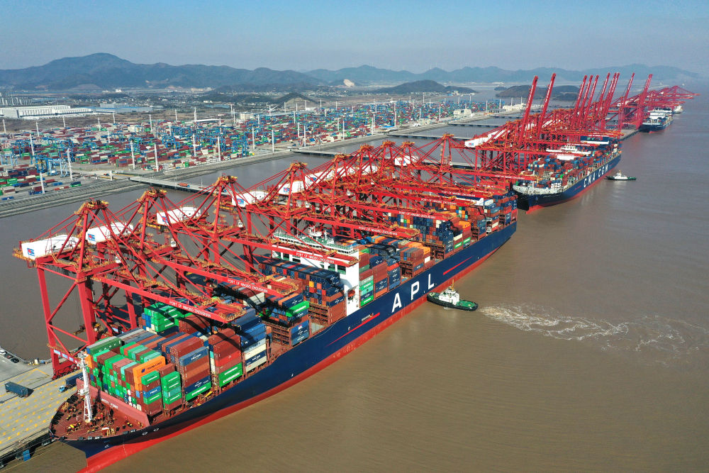货轮停靠在浙江宁波舟山港梅山港区码头(2024年1月24日摄,无人机照片)。新华社记者 黄宗治 摄
