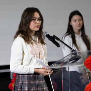 3月12日,在法国普罗旺斯-阿尔卑斯-蓝色海岸大区国际学校,中国驻马赛总领馆向学校转交习近平主席复信。这是该校中文班学生伊西丝在活动现场发言。新华社记者 邬惠我 摄