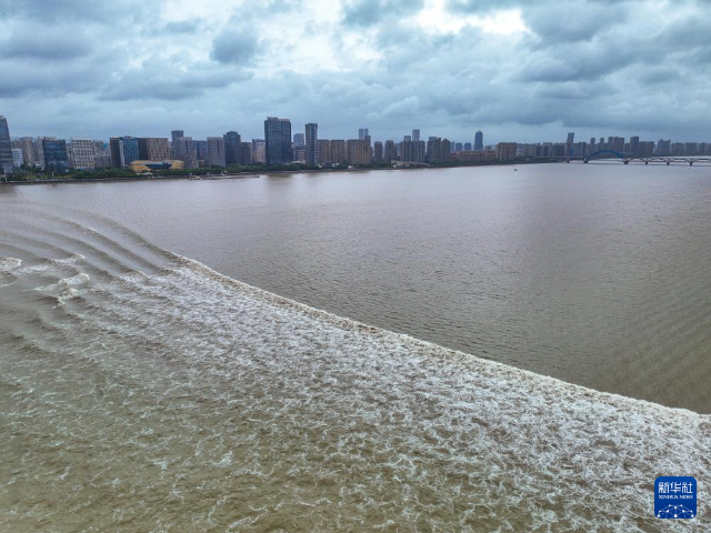 2024年9月19日拍摄的钱塘江潮水(无人机照片)。每年中秋节前后是钱塘江潮水的最佳观赏期,被誉为“八月十八潮 壮观天下无”。(图片来源:新华社记者 江汉 摄)