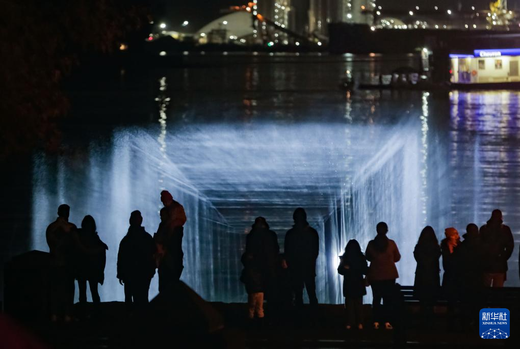 11月9日,在加拿大温哥华举办的灯光节上,人们观赏一个使用全息投影创作的灯光装置。