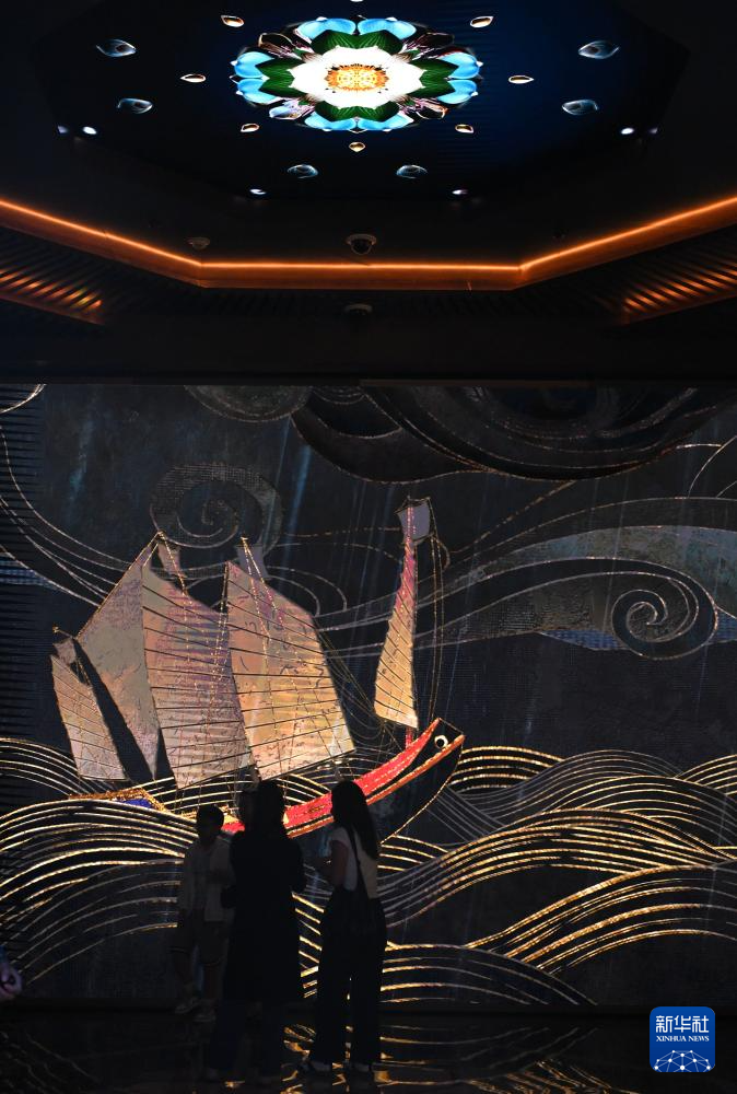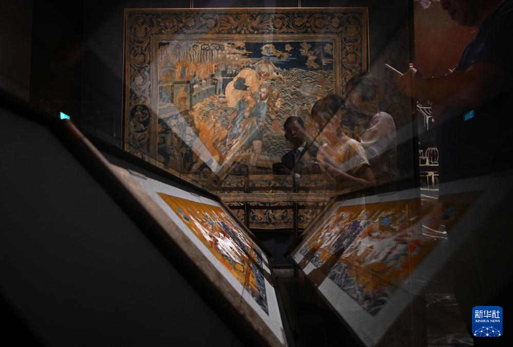 11月16日,观众在保利美高梅博物馆参观展出的云锦《丝路华章》卷轴。
