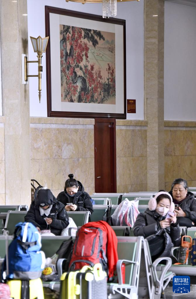 北京站候车大厅内悬挂的名家名画(12月18日摄)。