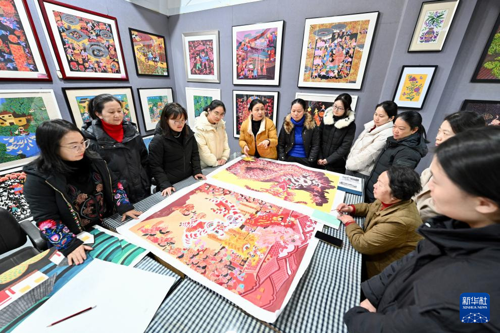1月10日,漳平市农民画院院长、“福建农民画”非遗项目省级传承人吴玉环(左五)向前来学习农民画的学员传授绘画技艺。