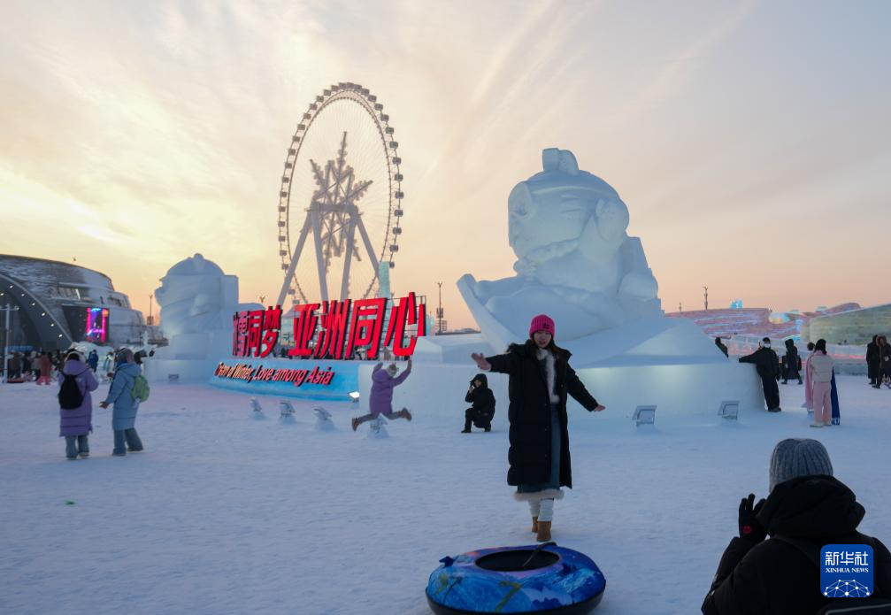 1月5日,在哈尔滨冰雪大世界园区,游客在亚冬会吉祥物雪雕旁游玩、拍照。