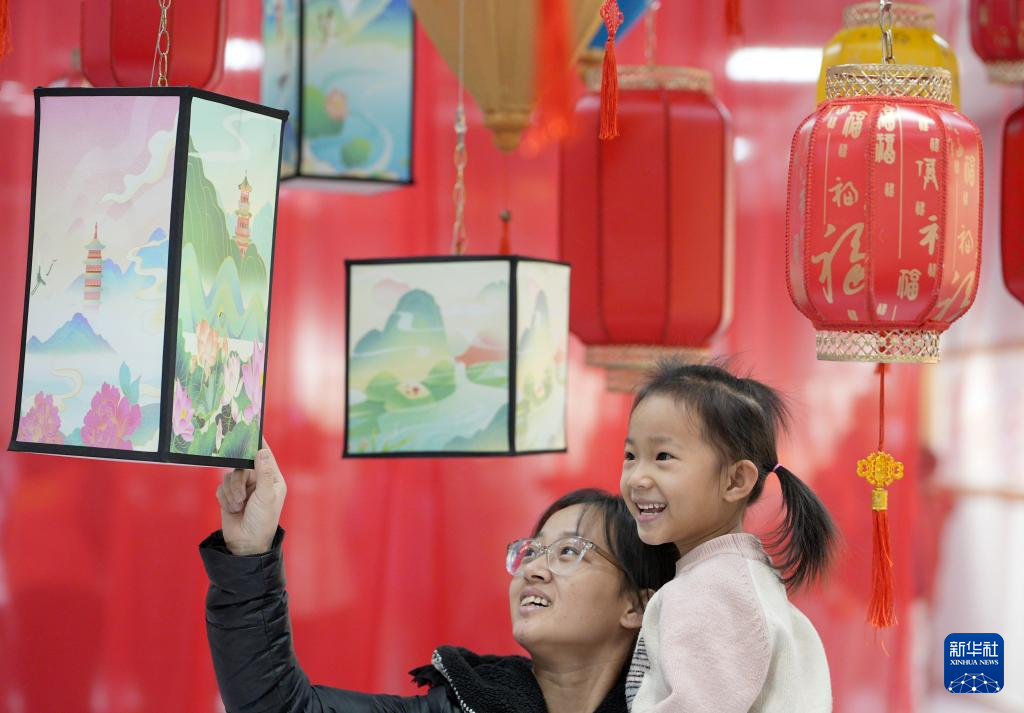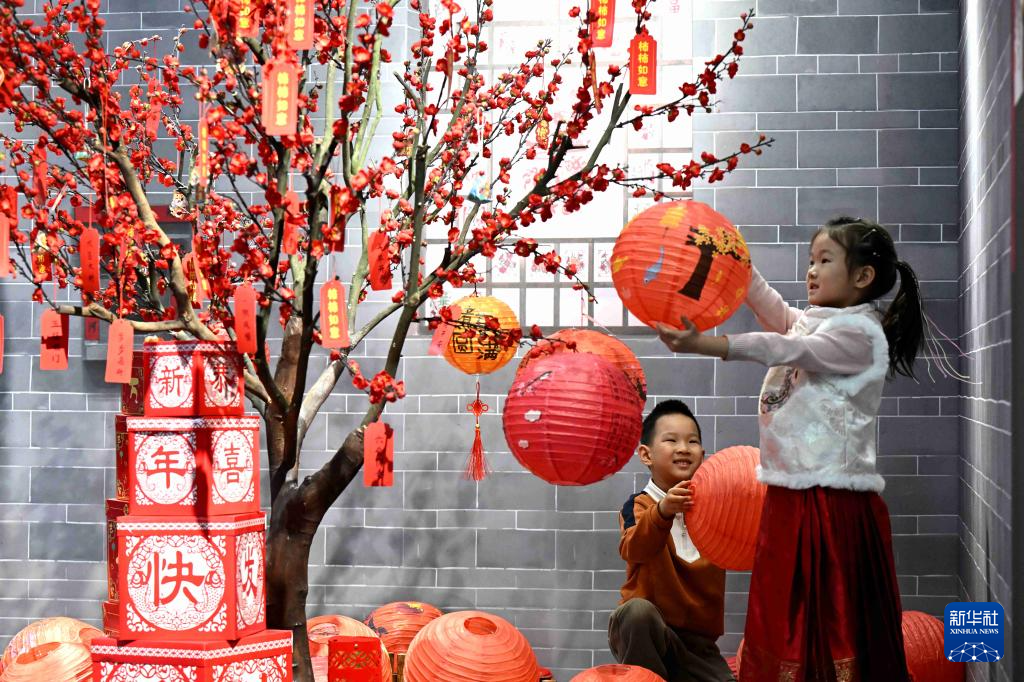 1月16日,小朋友在河北省群众艺术馆迎新春民俗文化展活动中悬挂灯笼。