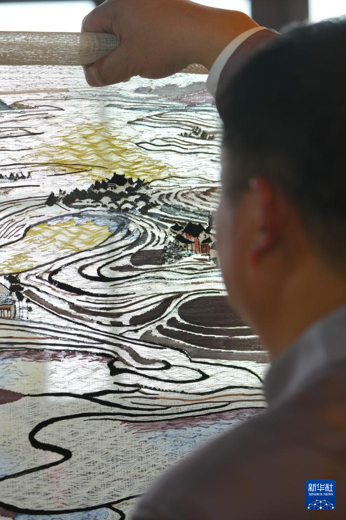 =2月19日,柯翔祥在位于德清乾元镇的“缂金堂”内展示利用水波纹设计制作的缂丝产品。