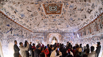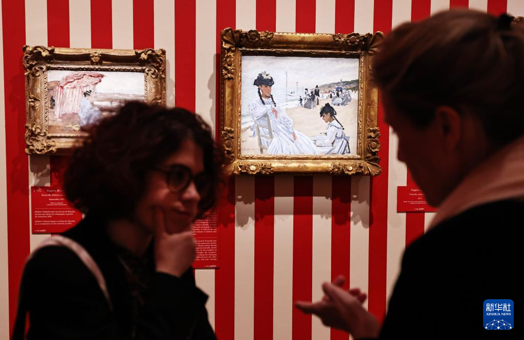 4月8日,在法国巴黎玛摩丹美术馆,人们在《“印象派之父”——欧仁·布丹》特展的媒体预展上参观(左边是布丹绘制的法国海滨城市海滩,右边是莫奈绘制的同一题材同一场景作品)。