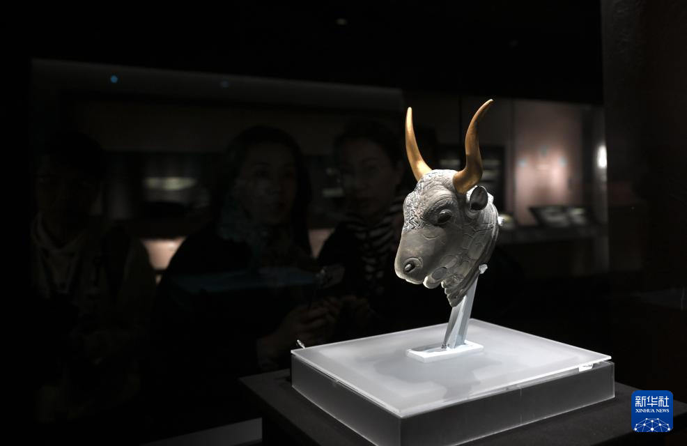 展出的公牛头形绿泥石来通杯(4月14日摄)。