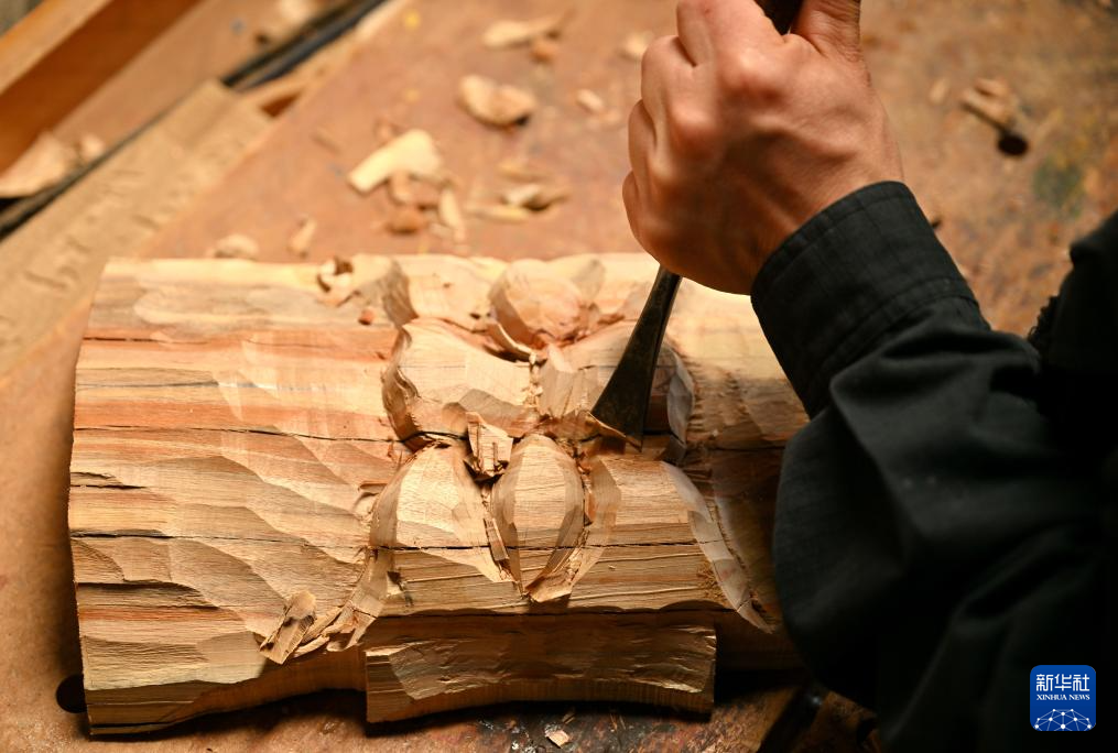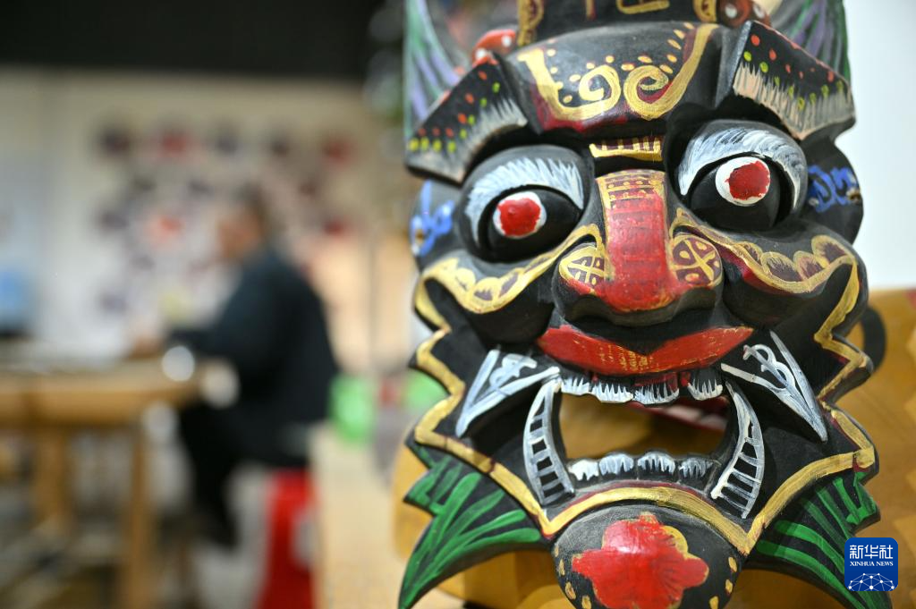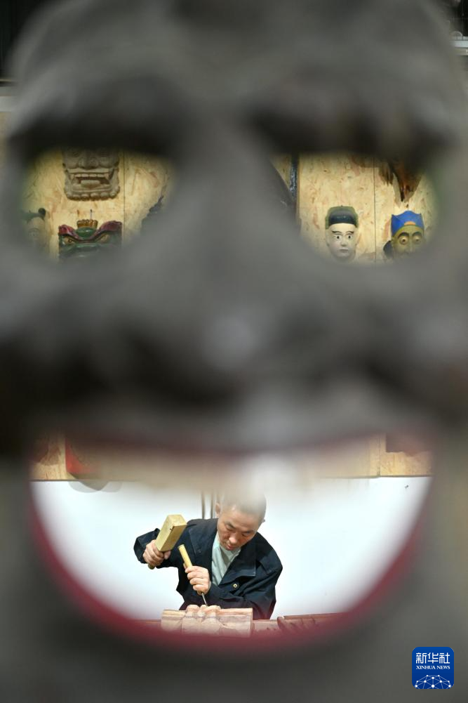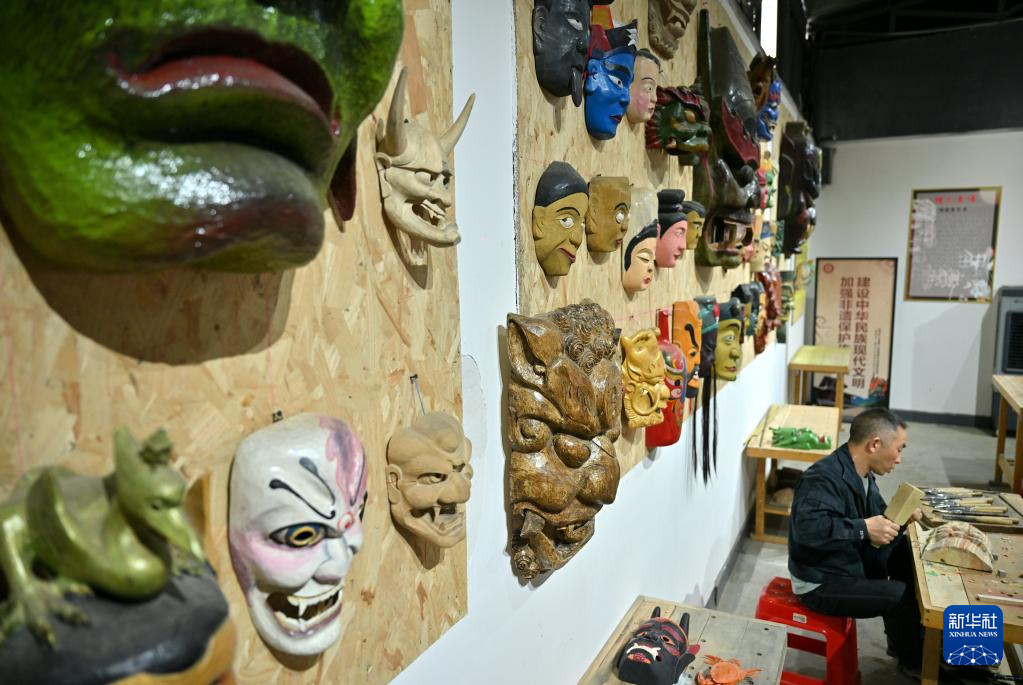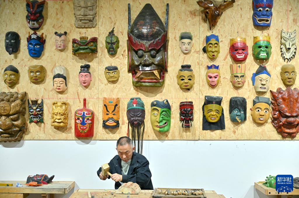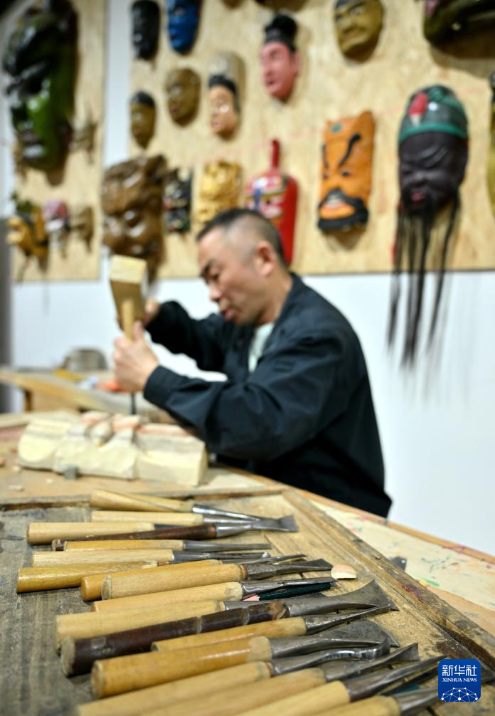 近日,湖北省恩施土家族苗族自治州傩面具制作传承人汪儒斌正忙着手工雕刻、绘制一批傩面具,为即将进行的一场傩文化研学活动作准备。