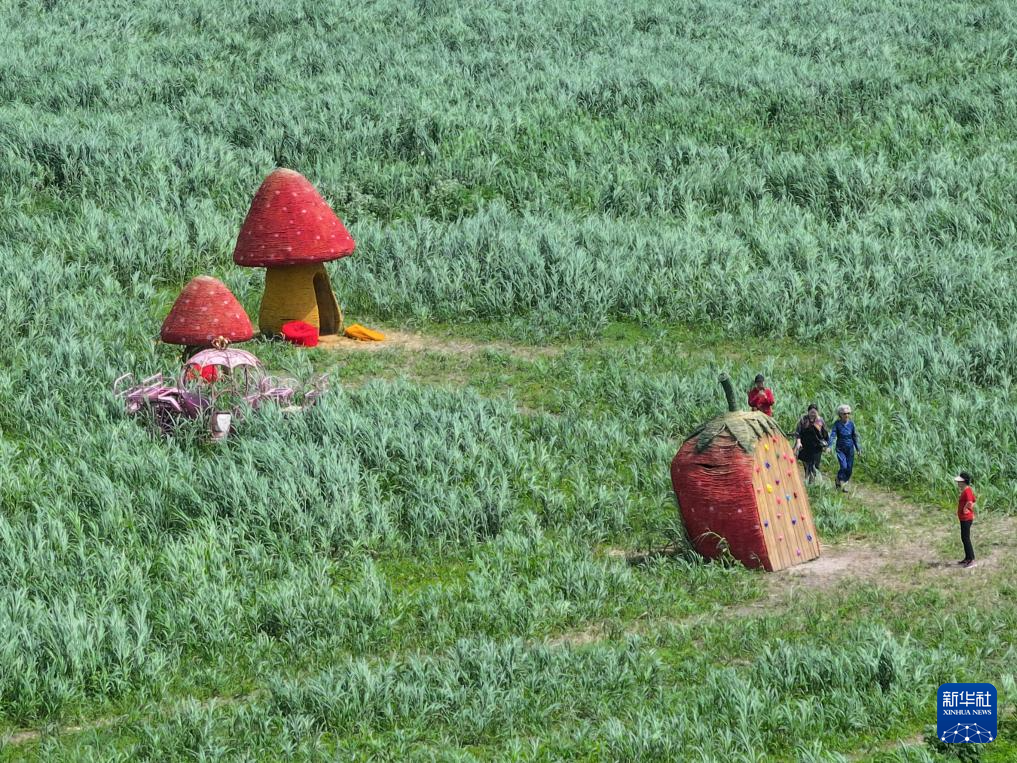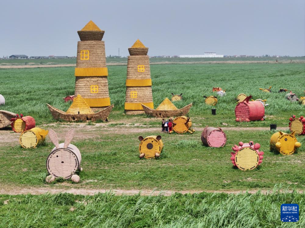 4月17日,在湖南省岳阳市君山区微笑绿洲生态营地,游客在芦苇艺术季活动现场游玩(无人机照片)。