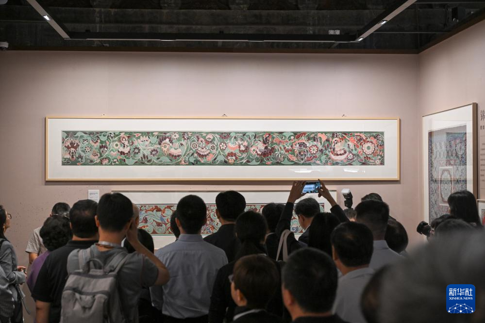 5月26日,嘉宾在“彩画千年——中国官式彩画传承与创新展”上观看莫高窟427窟人字披脊枋莲花伎乐童子彩画临摹图。