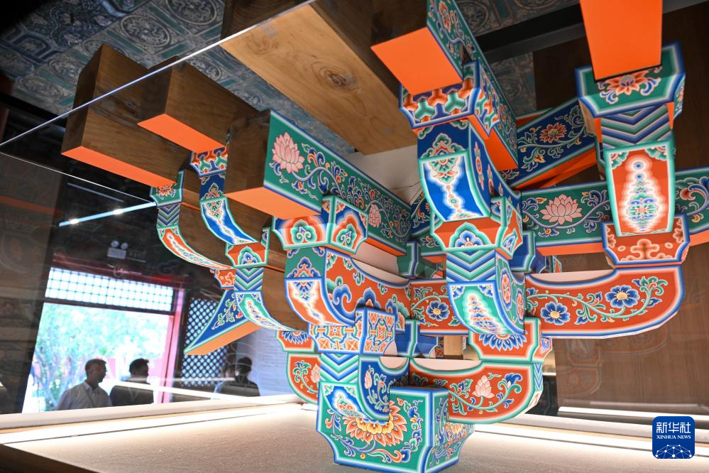 这是5月26日在“彩画千年——中国官式彩画传承与创新展”上拍摄的宋代五彩遍装五铺作斗栱彩画模型。