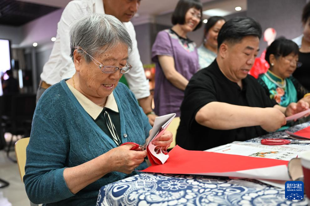 6月20日,剪纸艺术家马淑珍(前左)在呼和浩特职业学院美术馆创作剪纸作品。