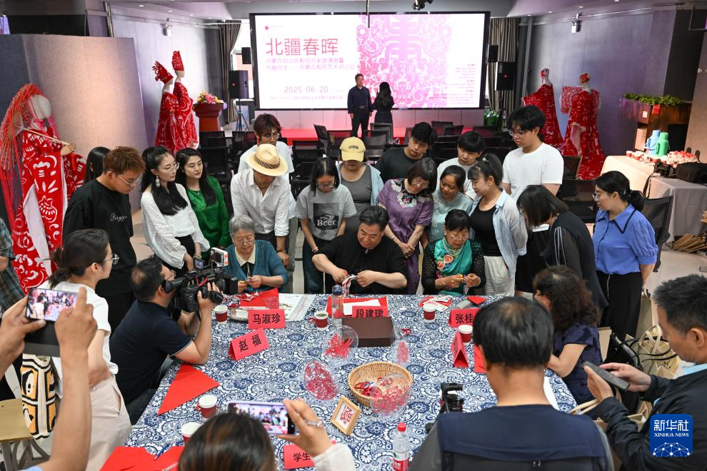 6月20日,剪纸艺术家在呼和浩特职业学院美术馆创作剪纸作品。