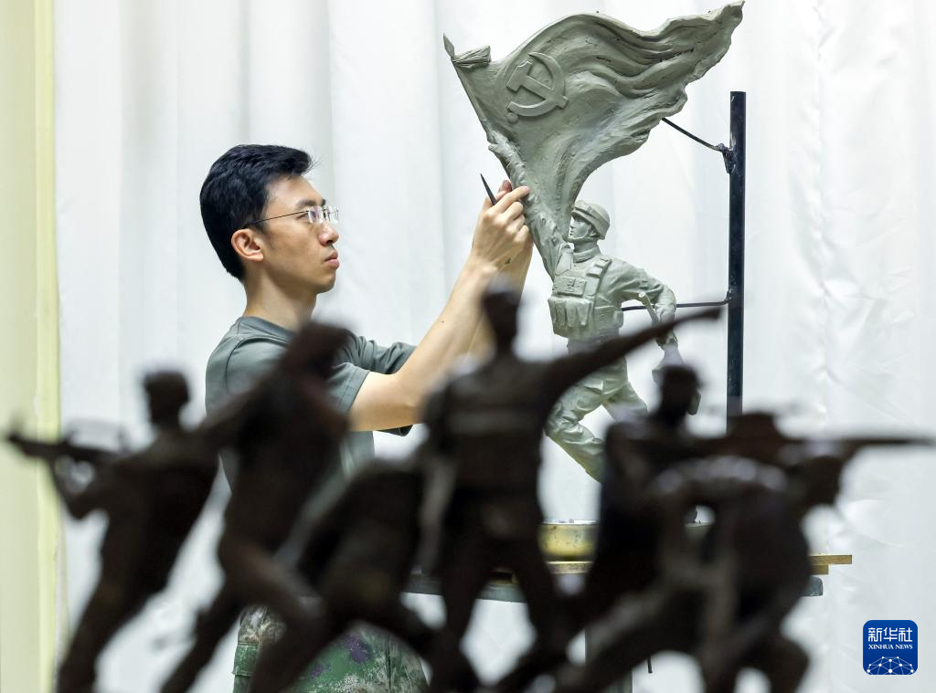 7月17日,解放军文工团雕塑创作员郎钺在擦拭雕塑。