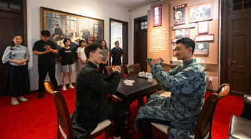 8月18日,游客在三福古典家具有限公司文创产品展示台试戴木制手串。
