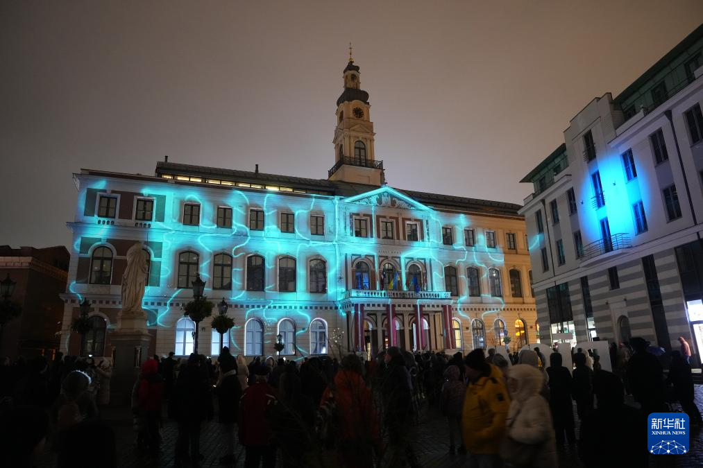 11月17日,民众在拉脱维亚首都里加举行的灯光节上欣赏被照亮的里加市政厅大楼。