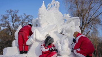 这是展出的戴金面罩青铜人头像(1月18日摄)。