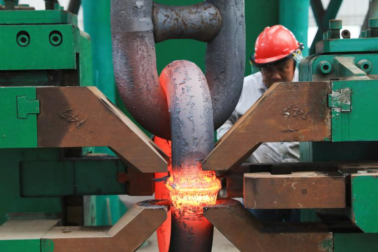 6月4日,在位于江苏省泰州市靖江市的江苏亚星锚链股份有限公司,工人在生产车间作业。新华社记者 毛俊 摄