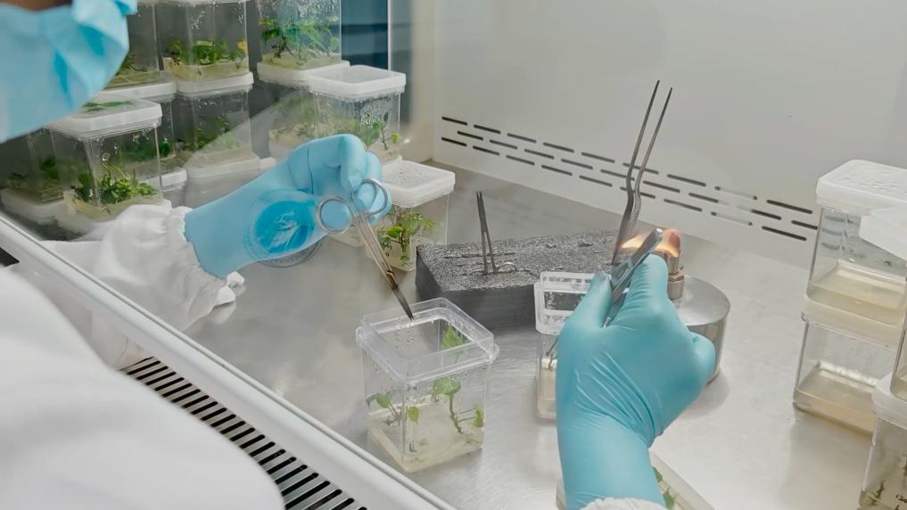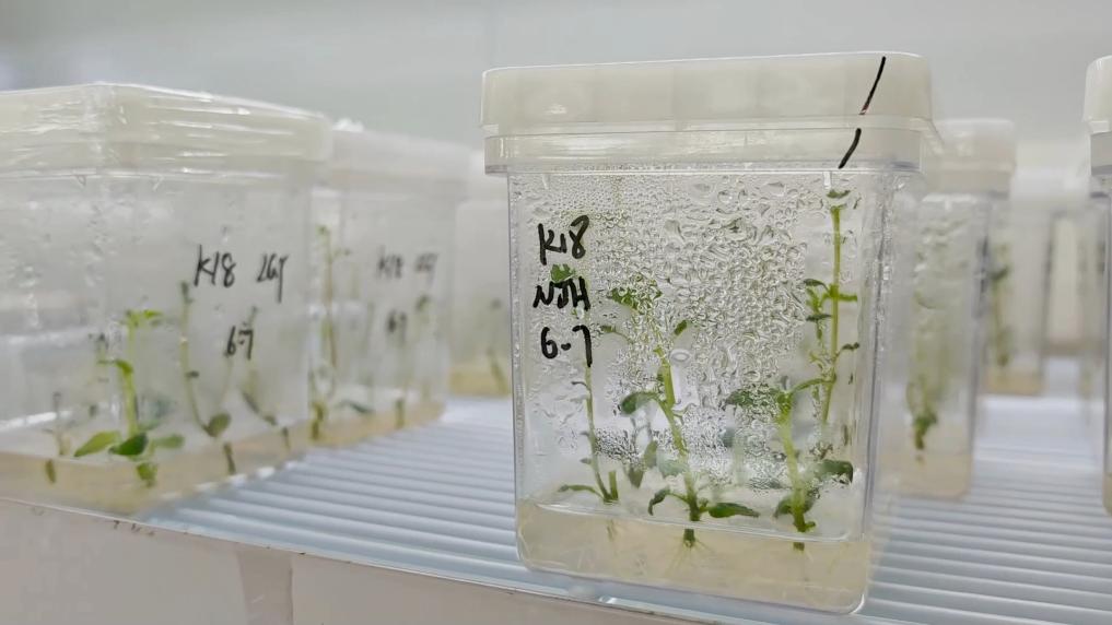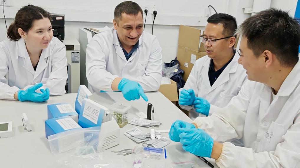 在西南大学科技大楼薯类生物学研究所的一间实验室内,来自哈萨克斯坦赛福林农业技术大学的两名师生,正和西南大学农学与生物科技学院院长吕典秋、薯类生物学研究所杨宇老师一起,使用马铃薯病毒快速检测试剂盒对马铃薯组培苗进行检测。
