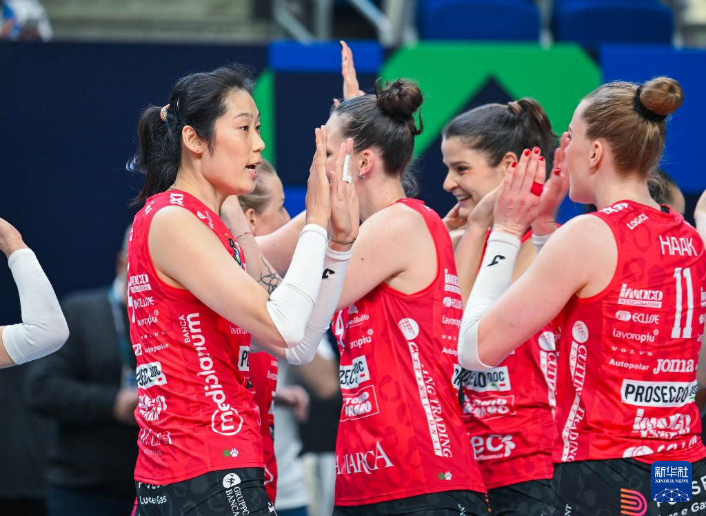 5月3日,意大利科内利亚诺队球员庆祝朱婷(左二)得分后与队友庆祝。