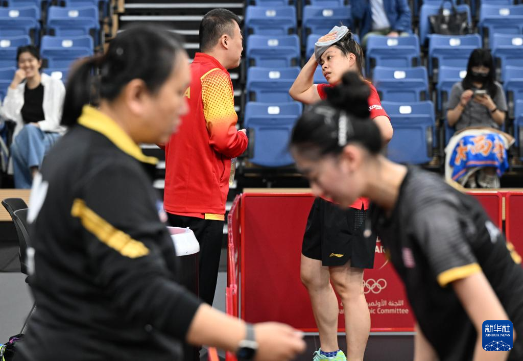 5月19日,中国选手王艺迪(右上)和美国选手王艾米在比赛间隙分别接受教练马琳(中)和高军的指导。