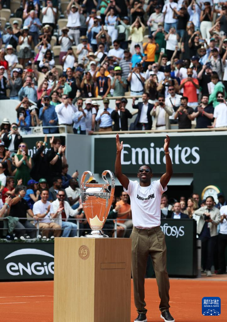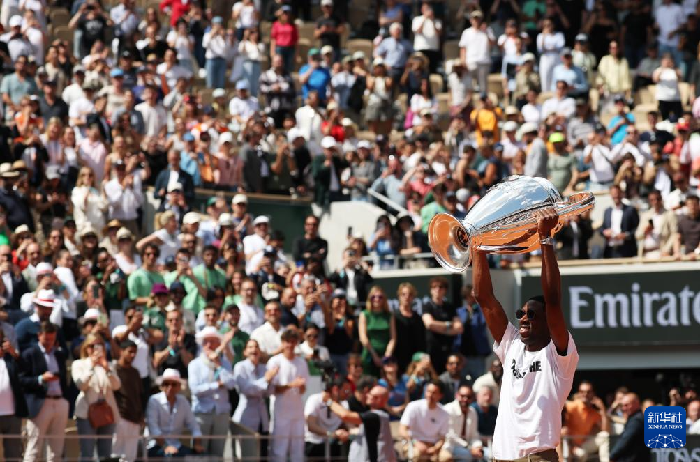 当日,法甲巴黎圣日耳曼队前锋登贝莱手捧欧冠冠军奖杯现身法网中央球场——菲利普·夏蒂埃球场。
